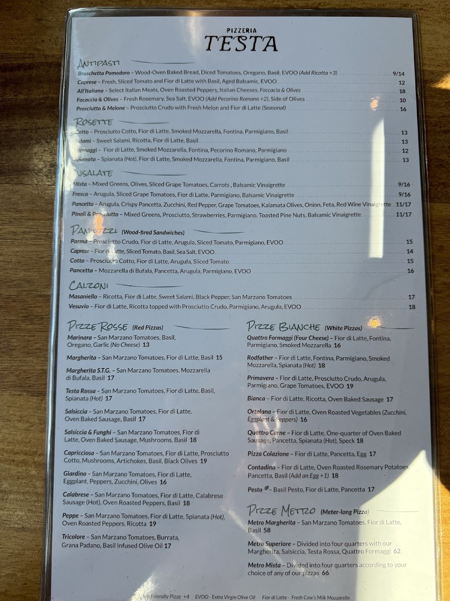 Nestled in the heart of Frisco, Pizzeria Testa offers an authentic Italian dining experience with its diverse and thoughtfully curated menu. Famous for its individual pizzas, you can indulge in delightful Pizze Bianche options like the creamy Quattro Formaggi or the hearty Quattro Carne, featuring a robust blend of meats. For those who prefer a touch of tradition, the Pizze Rosse shines with classics like the Margherita and the vibrant Tricolore, all crafted with San Marzano tomatoes and fresh ingredients.